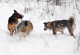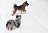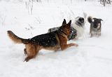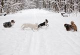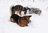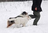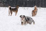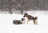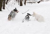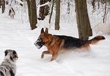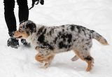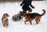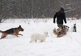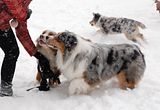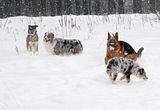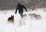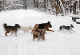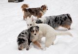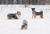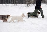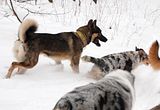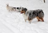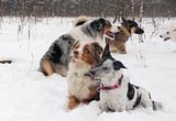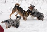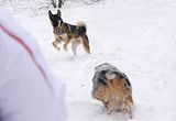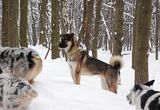 Byliśmy w niedzielę na spacerze. Nasze 3 psy: owczarek australijski, owczarek niemiecki, mix malamuta oraz towarzystwo: 2 owczarki australijskie, 1 border collie, 1 szczeniak białego owczarka szwajcarskiego. W sumie taki owczarkowy spacer. Nala i Shira zachowywały się cudownie, a Nemo różnie - jednak duża ilość psów w tym 3 niekastrowane samce bardzo go rozpraszały i co chwila próbował je dominować. Owsiki jeszcze w miarę mu ustępowały, ale z BC było parę spięć. I część spaceru Nemo przeszedł na smyczy. Następnym razem wezmę mu linkę.