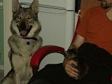 Widzicie tę minę? To czysta radość u niego. Żeby tylko zrozumiał, że musi spokojnie, po trochu i kot będzie do niego podchodził, to będzie dobrze. Na razie umiemy tyle, że kot sobie śpi na oparciu kanapy. Celar na kanapie, a Baaj obok, na łóżku. Jak na wilczaka, Baaja i dorosłego psa, ma genialną reakcję, czyli taką jak sądziłam.