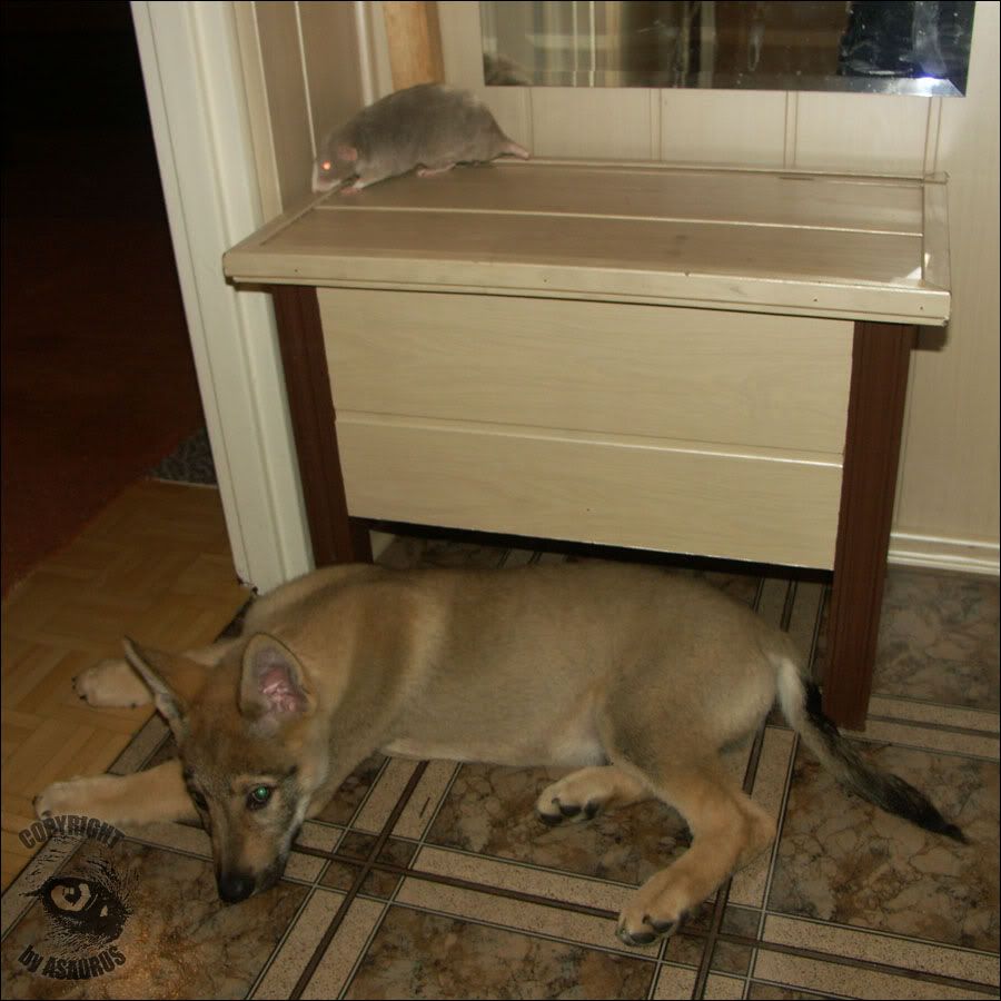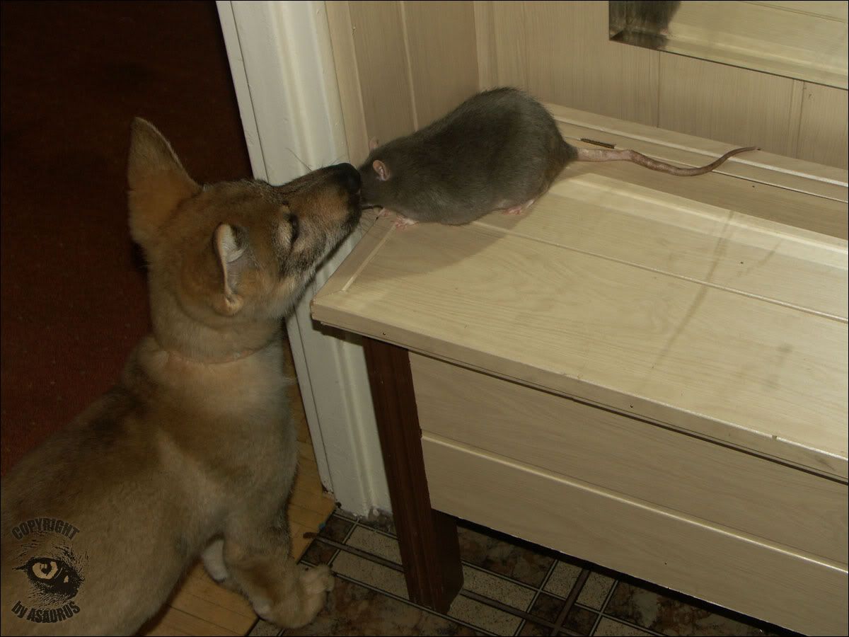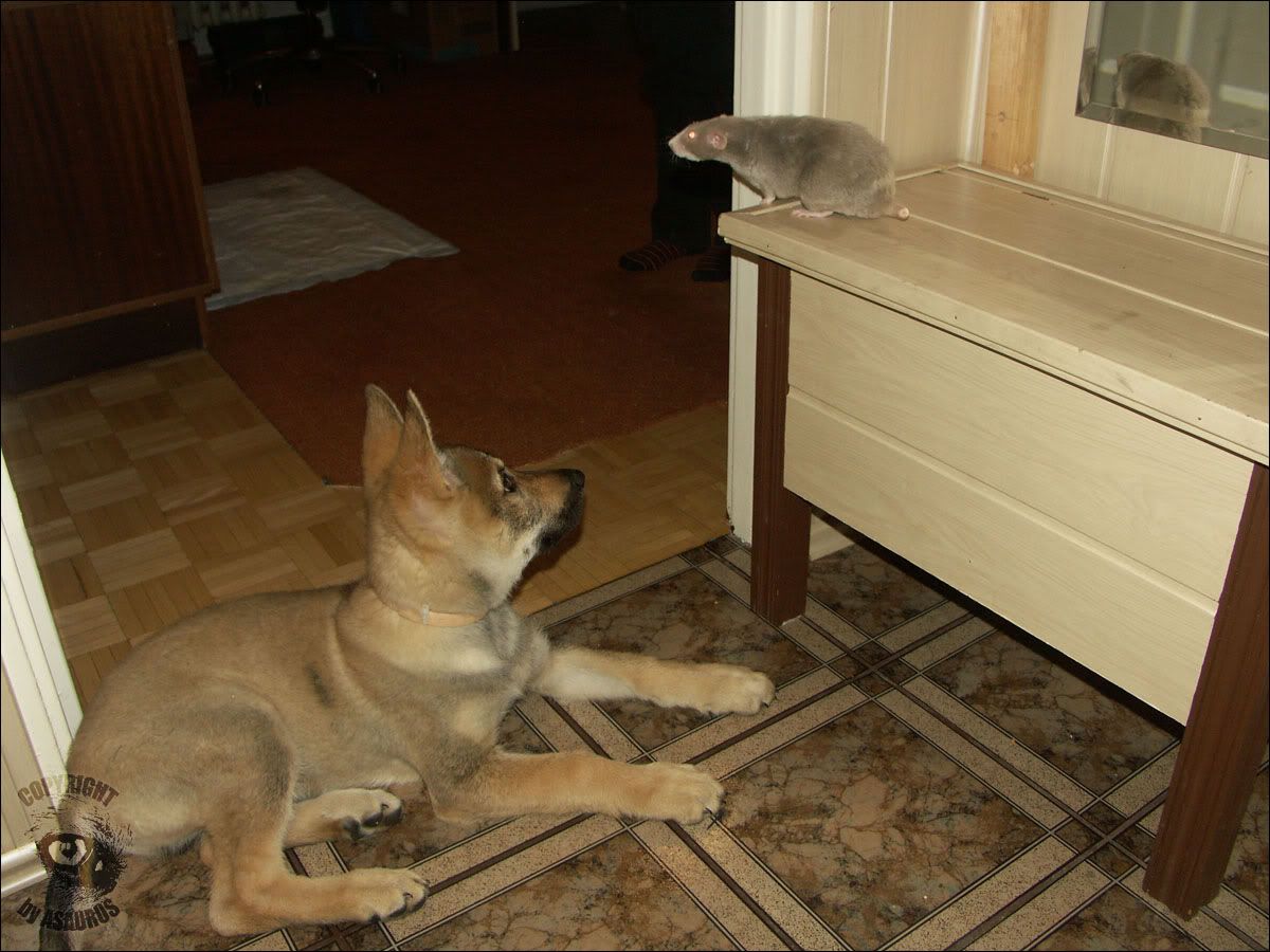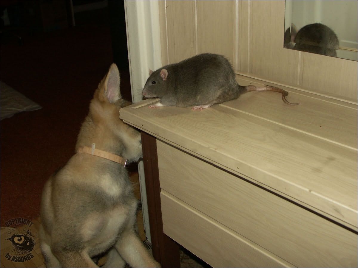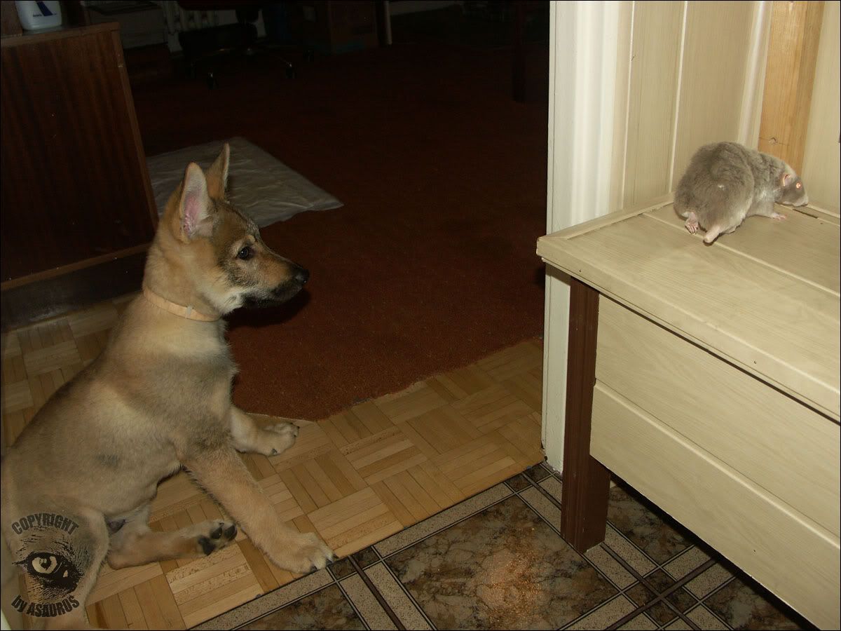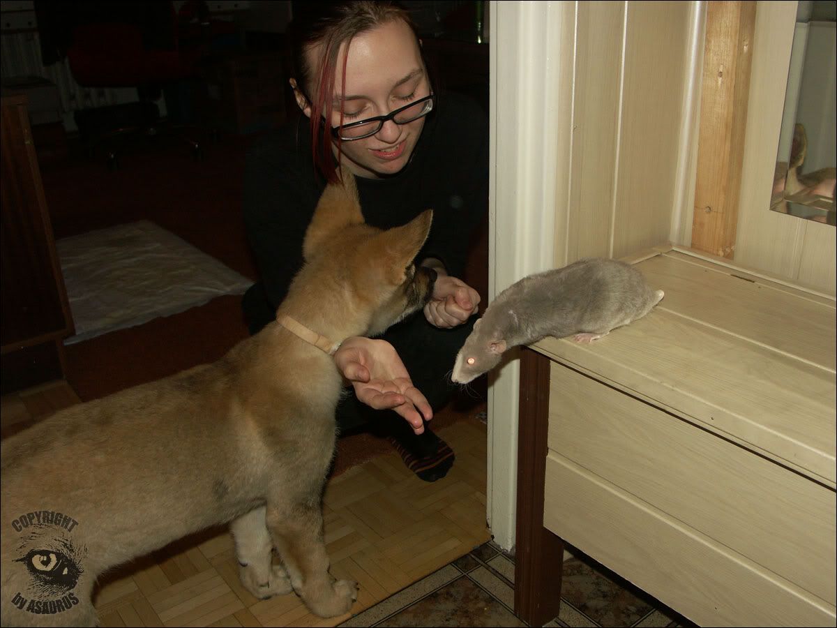Wczoraj Baaj miał kolejne zapoznanie ze szczurami. Tym razem z Cidem i Orbithem tylko, ale i tak było całkiem nieźle. Jeszcze próbuje łapać zębami ale już robi to na tyle delikatnie, że szczury wychodzą z tego tylko mocno obślinione.