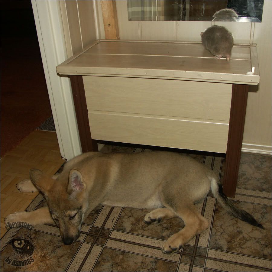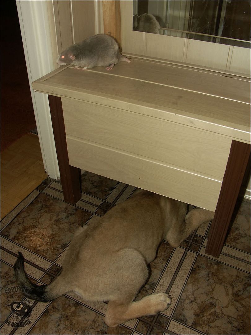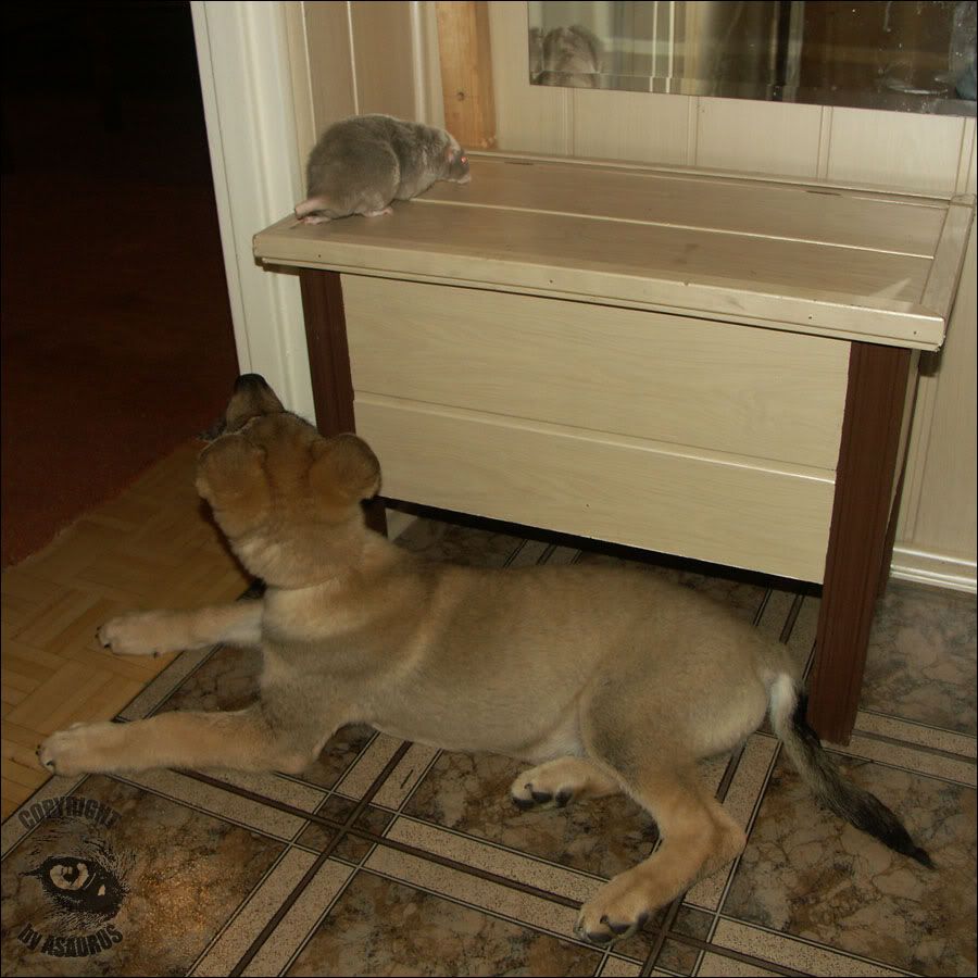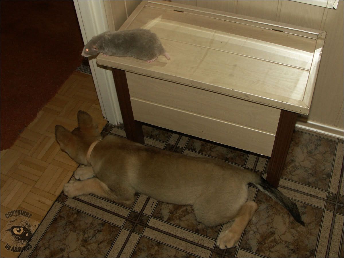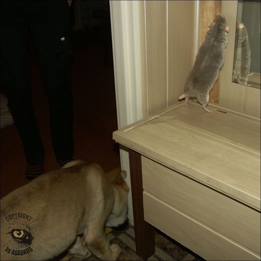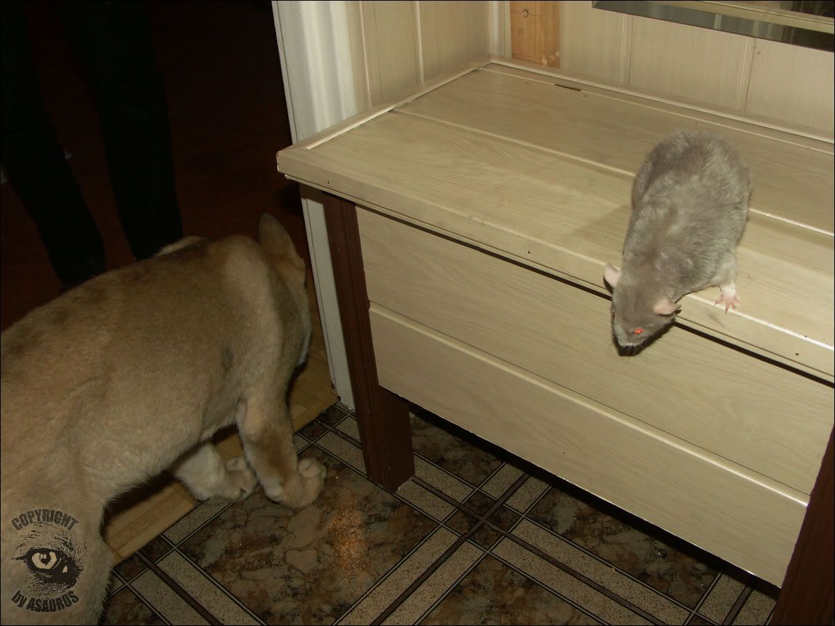 Wczoraj Baaj miał kolejne zapoznanie ze szczurami. Tym razem z Cidem i Orbithem tylko, ale i tak było całkiem nieźle. Jeszcze próbuje łapać zębami ale już robi to na tyle delikatnie, że szczury wychodzą z tego tylko mocno obślinione.