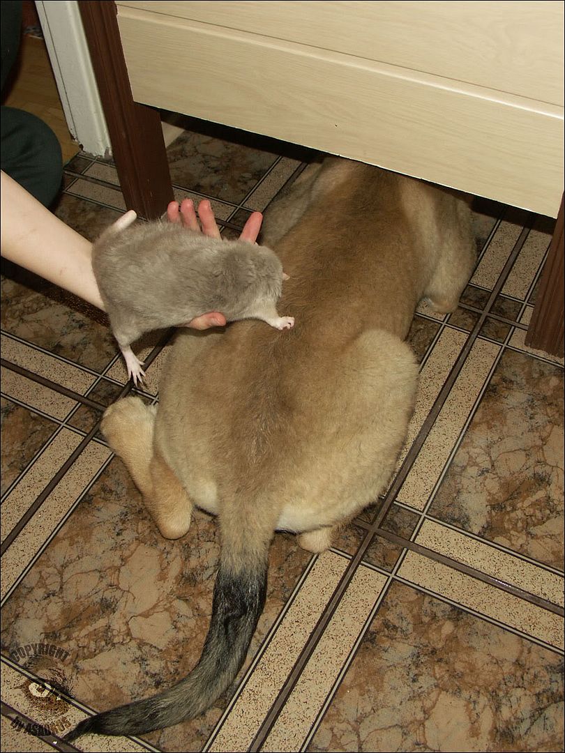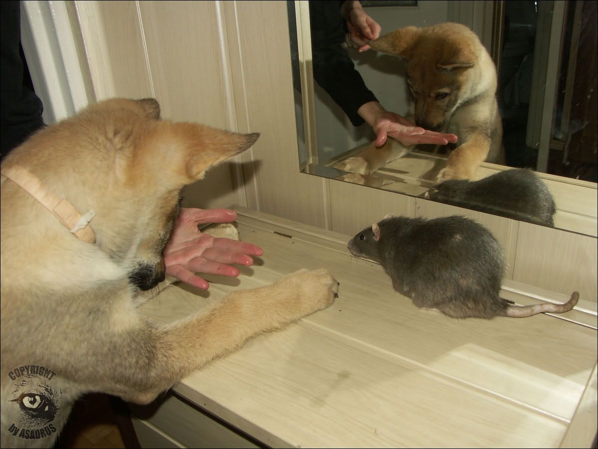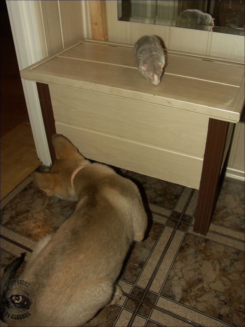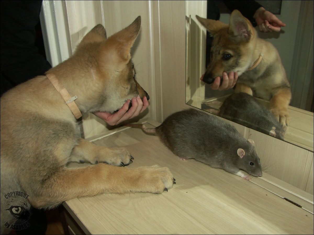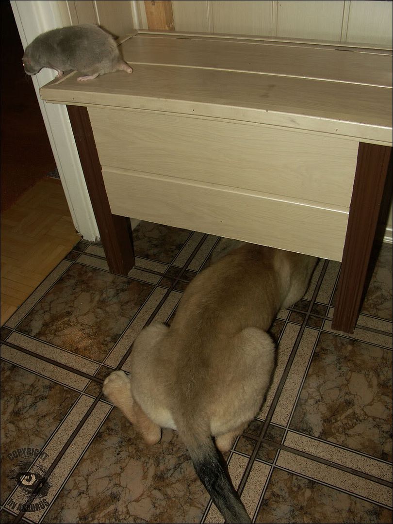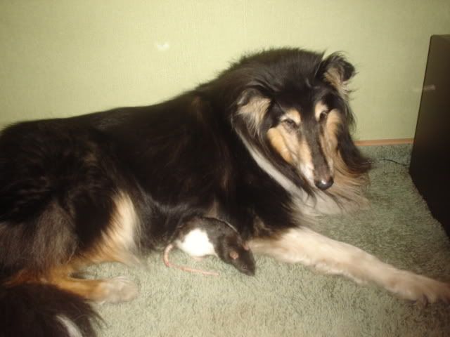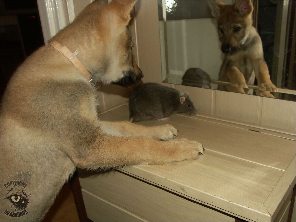 Wczoraj Baaj miał kolejne zapoznanie ze szczurami. Tym razem z Cidem i Orbithem tylko, ale i tak było całkiem nieźle. Jeszcze próbuje łapać zębami ale już robi to na tyle delikatnie, że szczury wychodzą z tego tylko mocno obślinione.