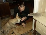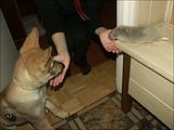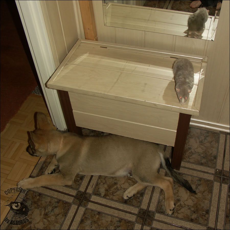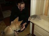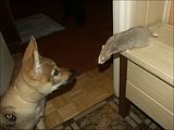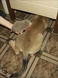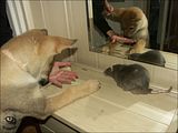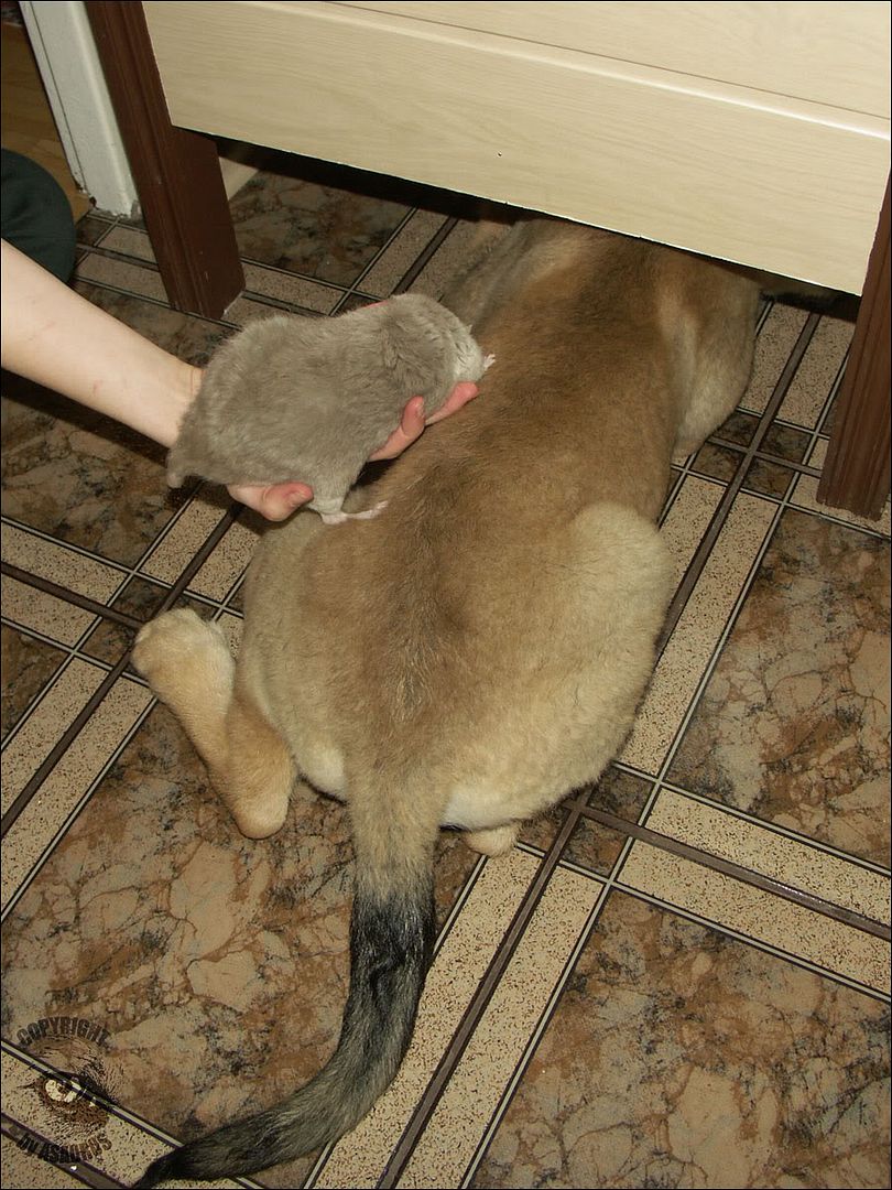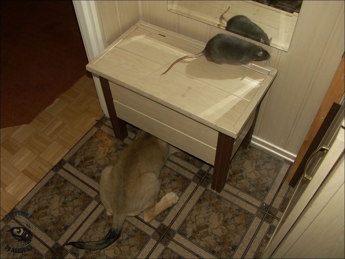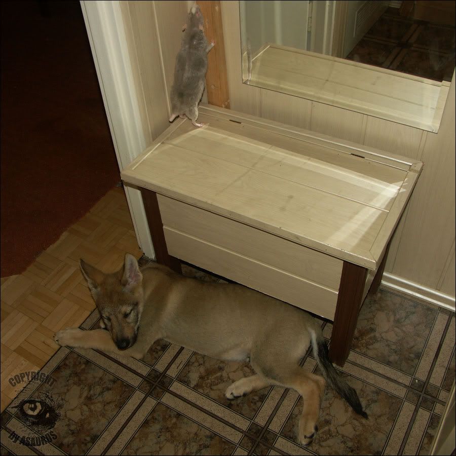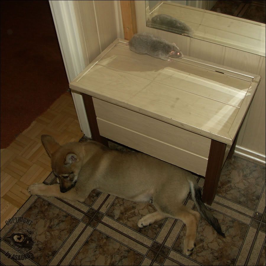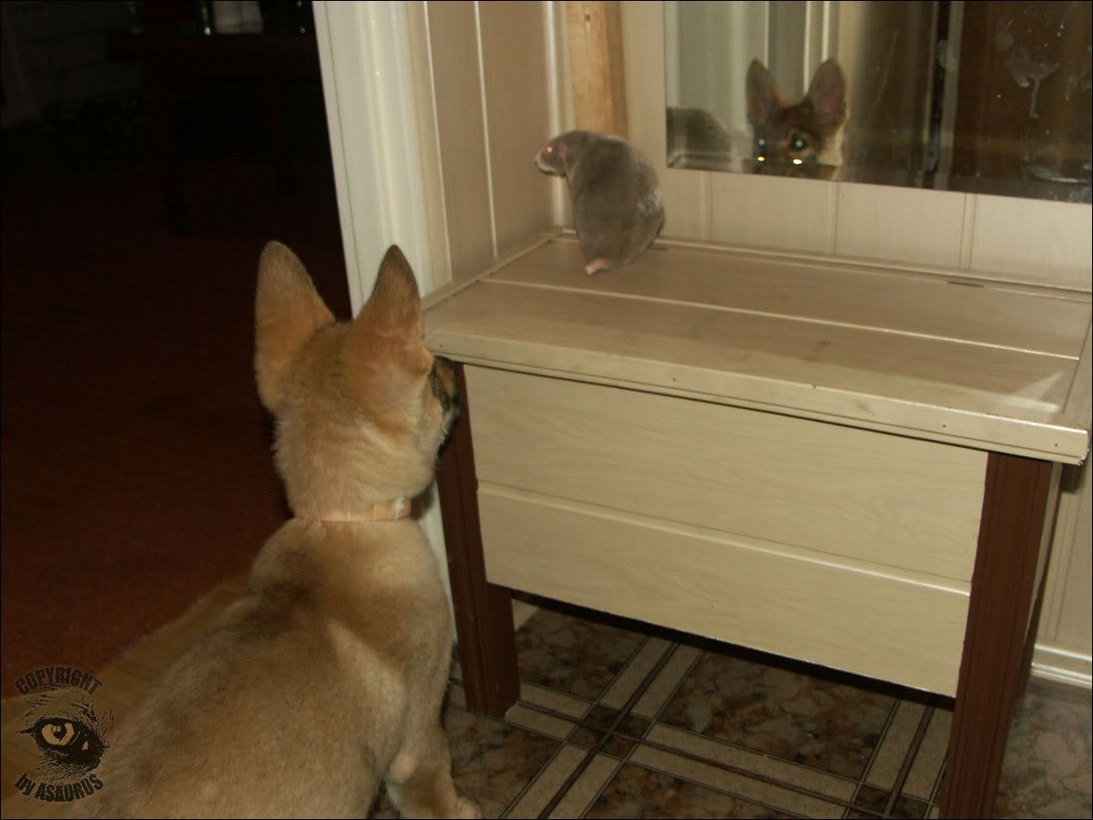 Wczoraj Baaj miał kolejne zapoznanie ze szczurami. Tym razem z Cidem i Orbithem tylko, ale i tak było całkiem nieźle. Jeszcze próbuje łapać zębami ale już robi to na tyle delikatnie, że szczury wychodzą z tego tylko mocno obślinione.
