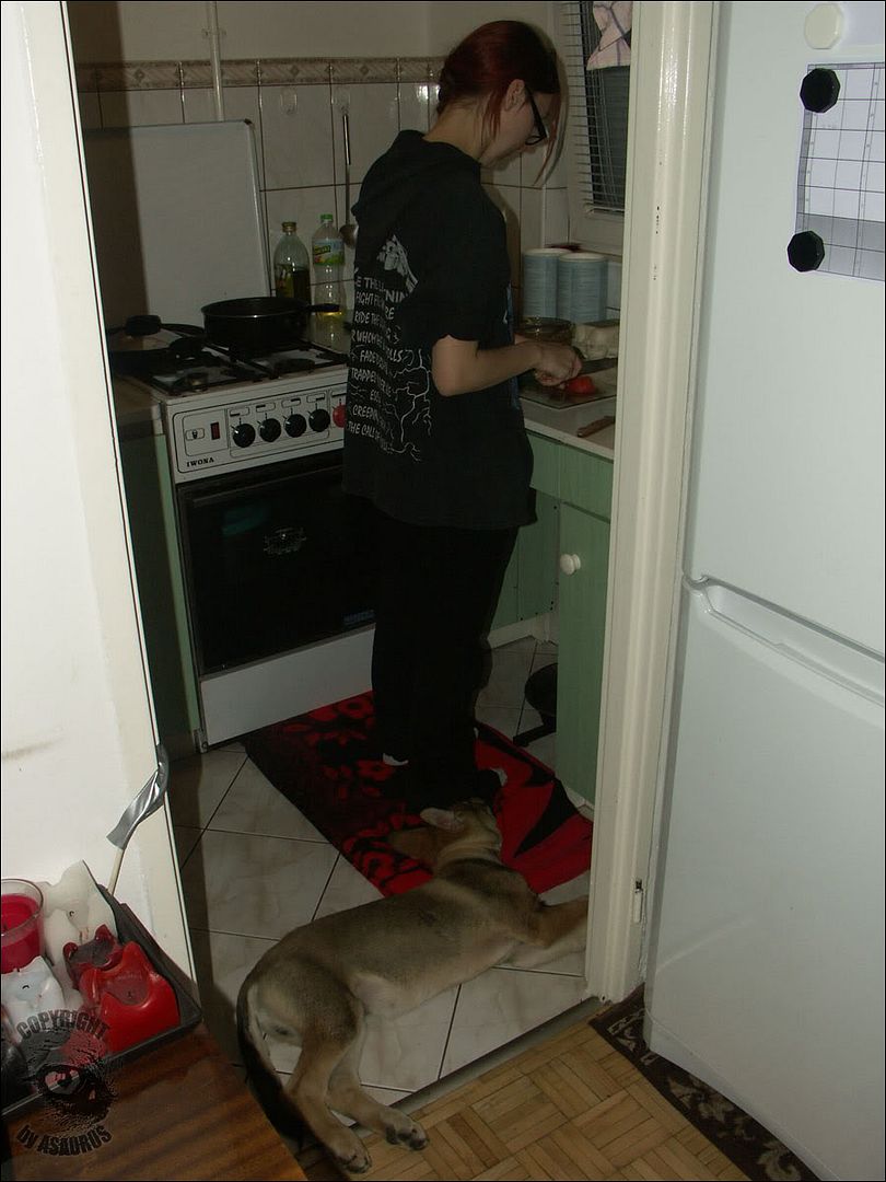No i w kuchni.. w sumie nieduża, ale jak on się rozłoży na środku to już koniec - cała kuchenna podłoga zajęta