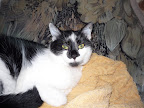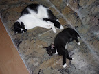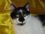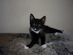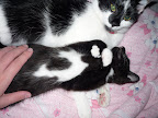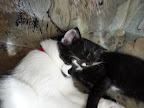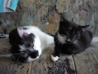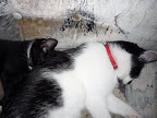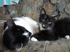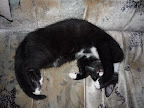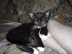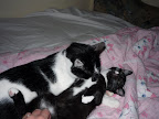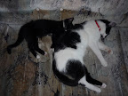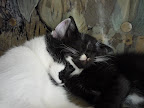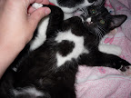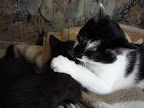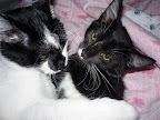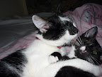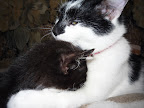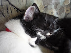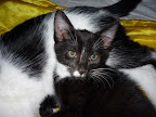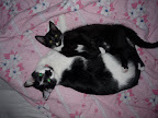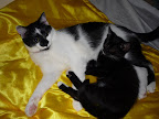 Zamieszczam w końcu zdjęcia "nowego" kota, a także rezydenta . Na niektórych widać, jaką Elmo (takie imię otrzymał "nowy" kot) ma ciekawą plamę na piersi - białą, a w środku niej czarną . Chłopaki ogólnie dogadują się świetnie, Gizmo bardzo się zmienił, stał się teraz "przewodnikiem" małego i w końcu przestał mnie gryźć - to jest jakiś cud . Czasem za bardzo znęca się nad Elmo, wtedy rzucam w niego klapkiem, oczywiście nigdy nie celuję, a tym samym nie trafiam, ale mały zdąży uciec. Maluch pozwala mi się głaskać, ale nadal jest płochliwy. Widać jednak dobroczynny wpływ długiego przebywania z matką - ten kot nie gryzie, co było dla mnie bardzo zaskakujące, bo Gizmo tak okropnie gryzł, jak był mniejszy, że nie sposób tego zapomnieć. Koty demolują mi mieszkanie, ale ogólnie im wybaczam, oprócz zrzucenia chomika razem z klatką (tymczasowo przeniosłam go na podłogę).