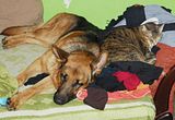 (a raczej tolerowanie się - Dianka lubi spać na stosach ubrań, takich świeżo wyprawnych i zdjętych z suszarki... wiadomo, na zasierszczonym i brudnym nie będzie leżeć ... a kiedy obok leży pies, cóż, biedna Dianka zniesie jego obecność z godnością )